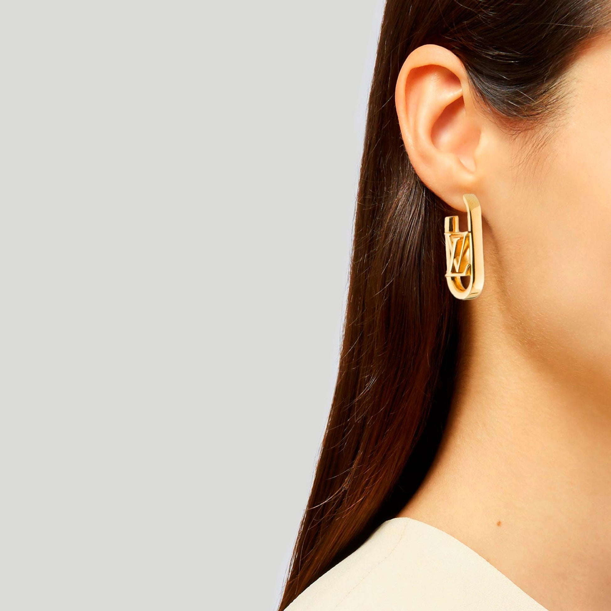 Inspired by the iconic temples of the My LV Chain collection, these earrings offer an elegant new way to wear the Lv signature. Chunky brass links are inset with two different House emblems: the LV initials on one and a Monogram Flower on the other. An asymmetrical look that complements the other jewels of the My LV Chain theme.